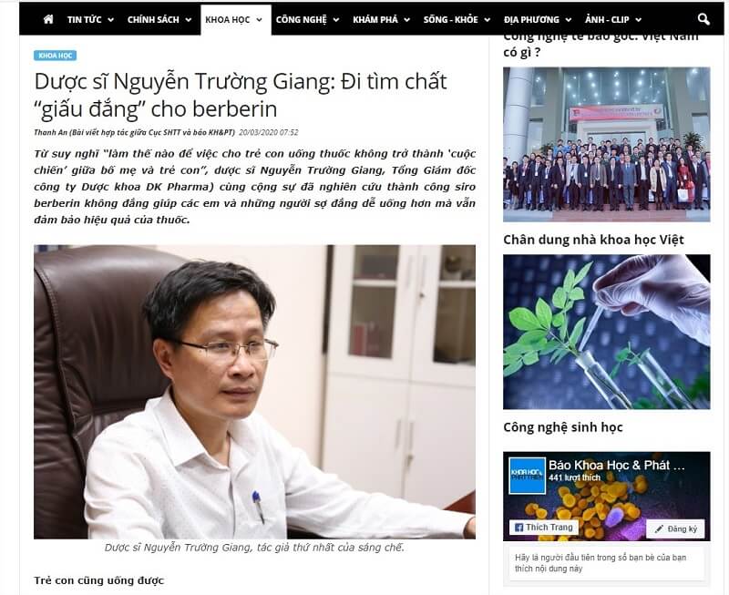 “Bài viết đã được công bố trên báo khoa học phát triển việt nam http://khoahocphattrien.vn/khoa-hoc/duoc-si-nguyen-truong-giang-di-tim-chat-giau-dang-cho-berberin/20200319022445851p1c160.htm?fbclid=IwAR2ZCG6K1hEIZH2djz6Nmo60j9p_pMh4_7jxm0gfFROtML3Ue3DA10s0uk